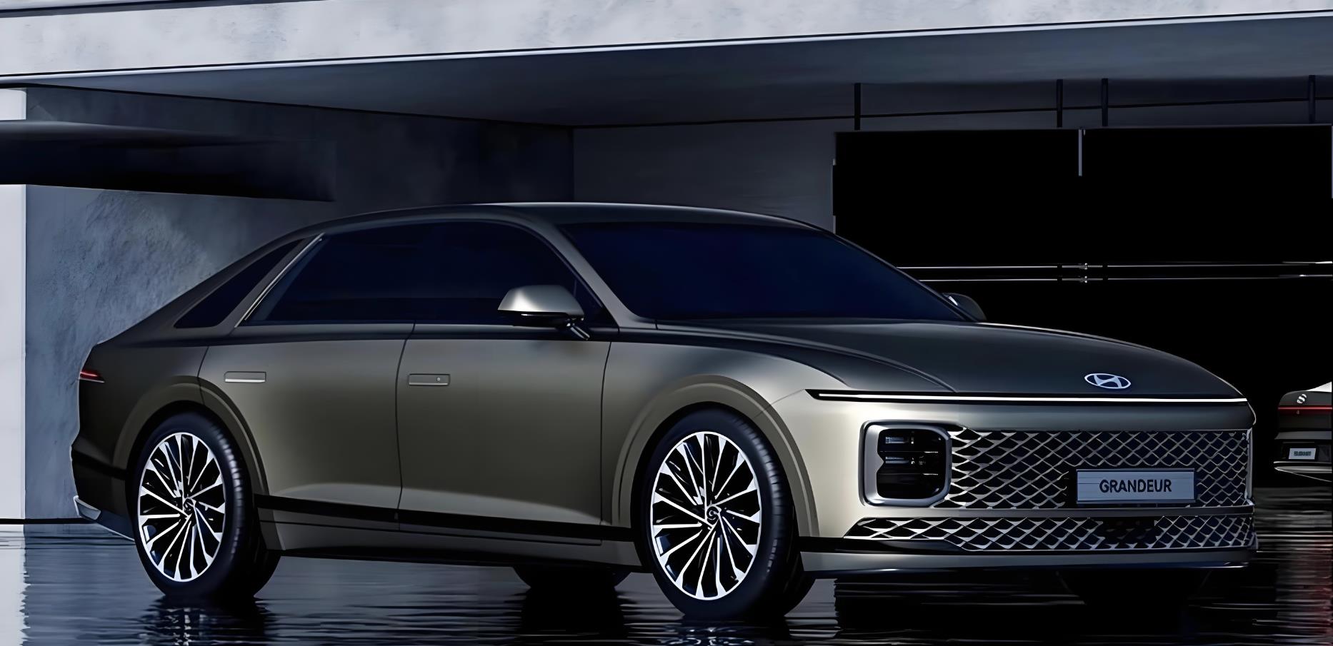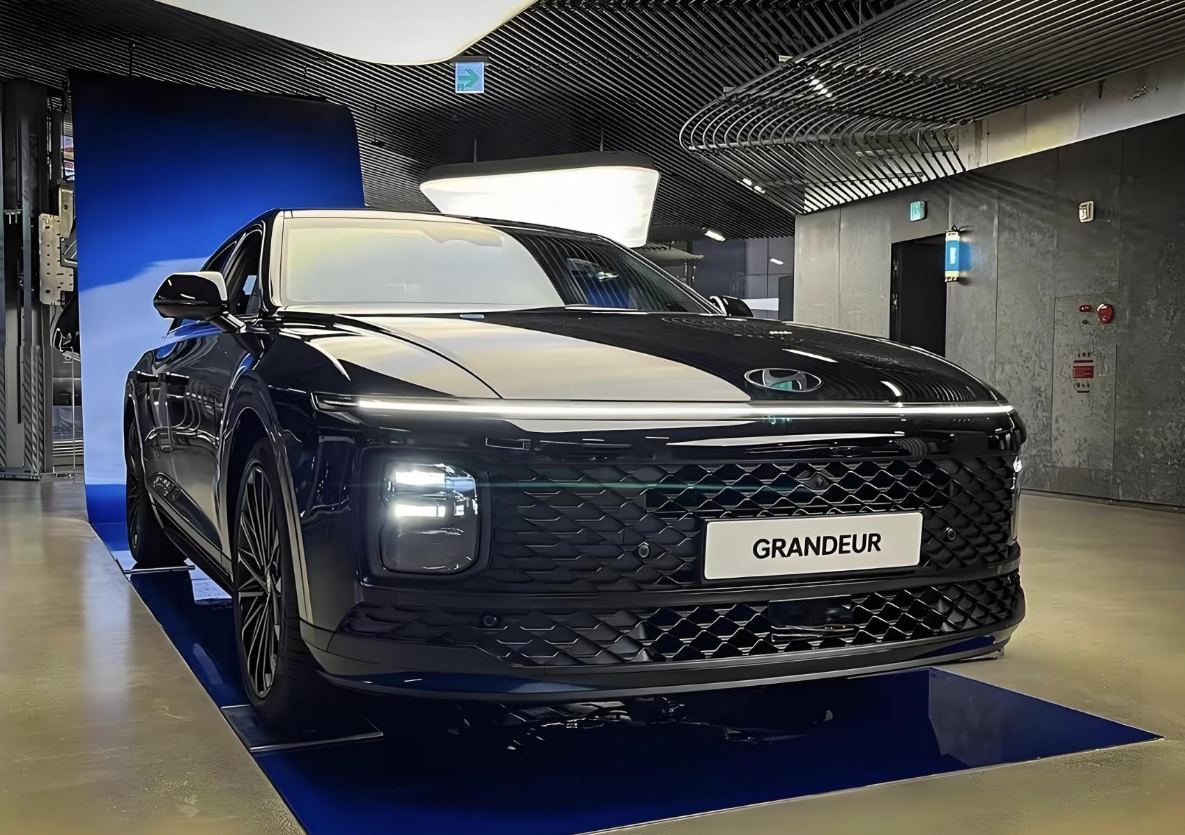 颜值方面,全新的现代雅尊加入了新能源车型的经典设计元素,整个车头的造型更加宽扁,配备了现代标志性的“无缝地平线灯”(seamless horizon lamp),带有透镜功能的LED远近光光源被放置在格栅两侧的导流槽区域,分体式的前大灯个性化十足。无边界的格栅搭配着菱形浮雕样式的封闭式中网,前舱盖还配备了可发光的现代车标,贯穿式的前保险杠也同样加入了菱形镂空中网,十分复古。车尾配备了横向贯穿式的尾灯,只不过更加纤细,呼应了车头,也提高了夜间辨识度。后保险杠的造型十分简约,配备了黑色包围和银色的护板,层次感丰富。