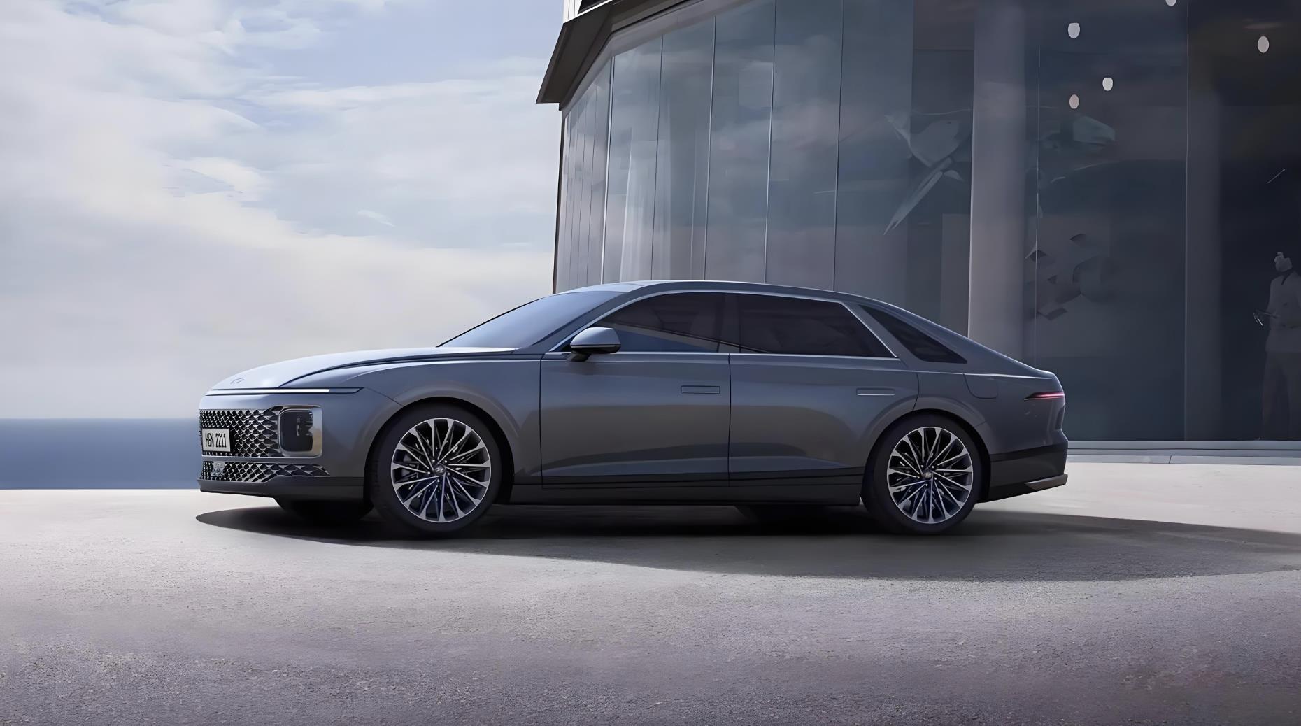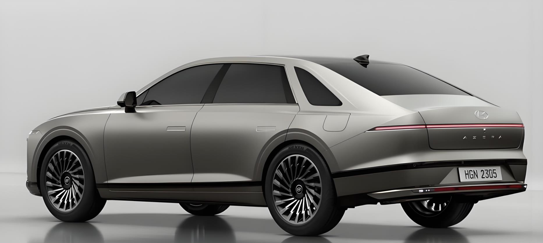 来到车身侧面,新一代现代雅尊采用了类似楔形跑车的轮廓造型,倾角更大的A柱与弧线形的车顶一气呵成,加长的车身还预留了前三角窗和后三角窗设计,让整车的侧面更加修长。黑色加宽的B柱与全车黑色隐私玻璃融为一体,隐藏式的门把手和厚重的车门,再加上20英寸的密辐式轮圈,也凸显出它行政级豪车的身份。尺寸方面,参照现款在售的现代雅尊来看,长宽高为4895×1865×1490毫米,轴距达2845毫米。全新一代的现代雅尊车长有望超过5米,轴距也有望突破3米。