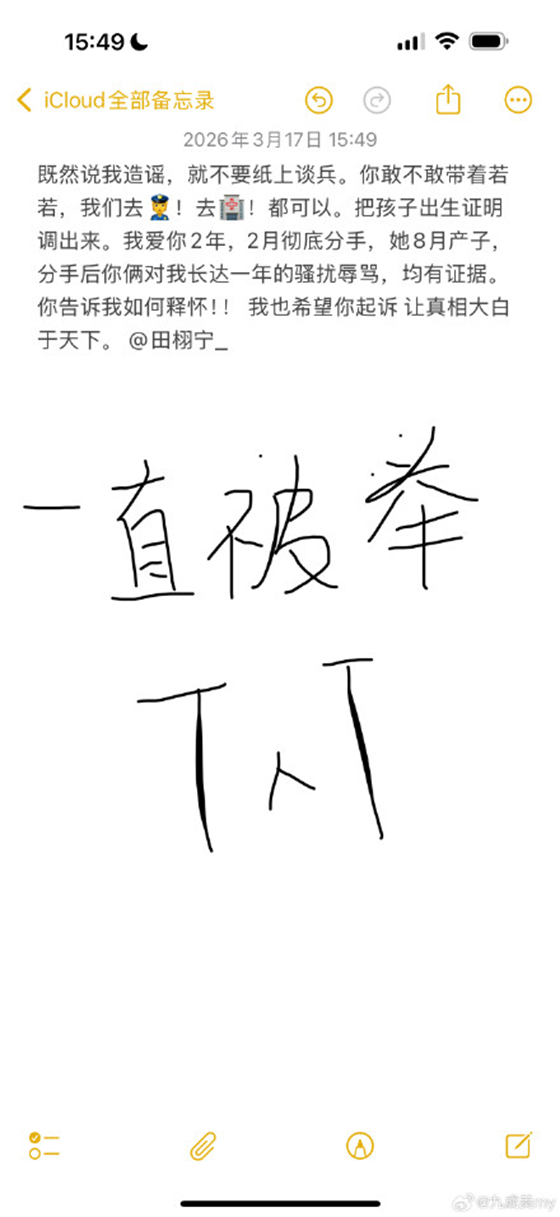 九成美在微博中反复强调核心时间线:她与田栩宁于2024年2月彻底分手,可田栩宁的现女友若若,却在同年8月生下一个孩子。她控诉,分手后的一年里,自己持续遭受田栩宁与若若的骚扰辱骂,不堪其扰,且已完整保留相关聊天记录、录音等证据,随时可以提交司法机关。